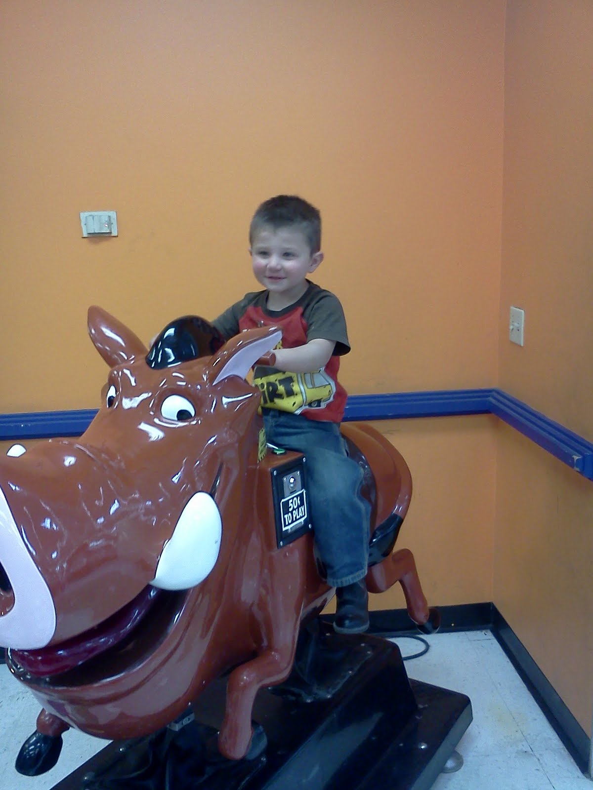 Stockden is as busy as ever. He has been going to a friend of mine's house on Tuesday while I sleep. She has a little boy and they just play and play. I love that he has a friend and is completely worn out after being over there. Jose's brother Andres's ward had fathers and sons on Friday and Jose and Stockden were invited to come. Stockden had a blast. They went camping out by Gunlock. He kept saying I love camping. Jose said that Stockden thought sleeping in a tent was the coolest thing ever and wants to get a tent so he can go camping with his dogs and his girls. He is so funny. He calls his sisters his girls. He was such a good boy at the store the other day so he got to ride Pumba from Lion King and thought it was great. Here are some pictures.